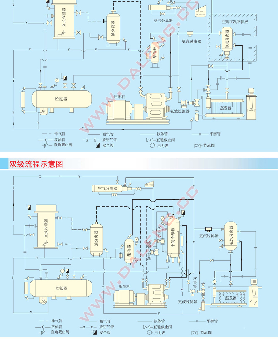 该系列压缩机在冷凝温度≤40℃,蒸发温度单级+5℃~-30℃,双级-25℃~-45℃的范围内,应用于需要实现人工制冷的场合。如石油、化工、制药等工业产品的生产, 食品的低温加工储藏和运输,工厂、医院及公众场所等大型建筑的空气调节等。