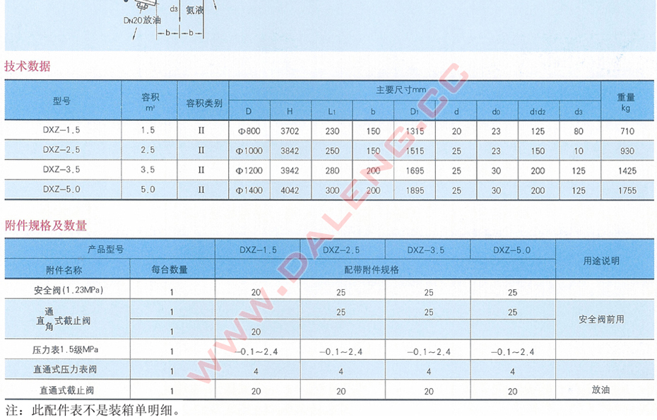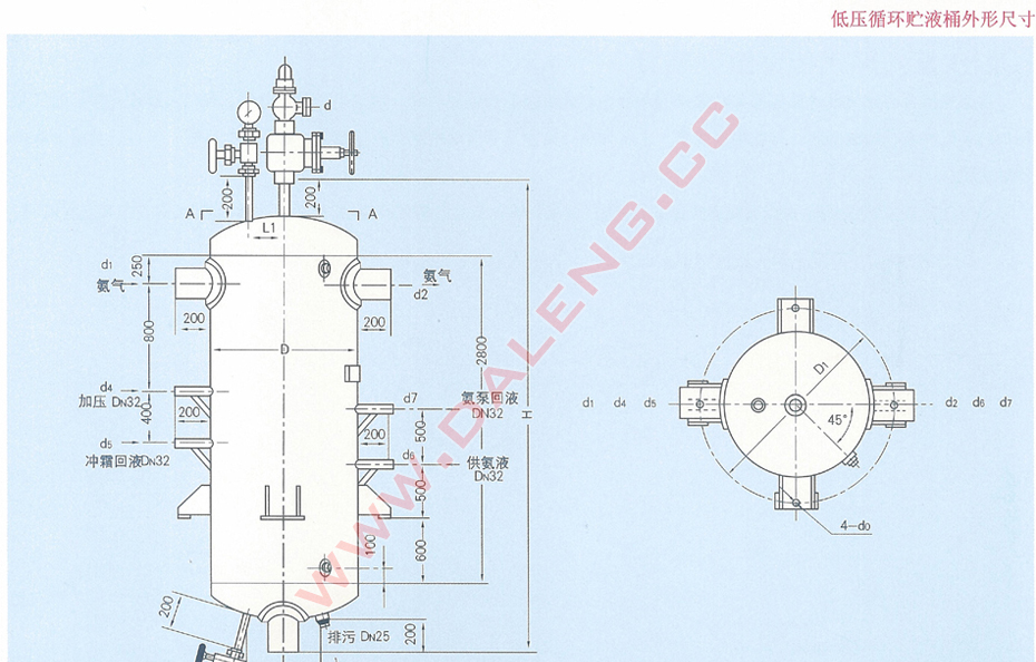 立式容器。主体为圆柱形简体及上、下两端与两只椭圆形封头焊接成一体所组成,简体上部两个侧面分别有进气、出气接管一个,在简体中部有供液接管,靠近下封头的筒体侧面有出液管,此出液管在系统中与氨泵相连。上封头装压力表与安全阔,下封头底部有放油阀。筒侧设有浮球阀(或液位控制器)上下二接管。
