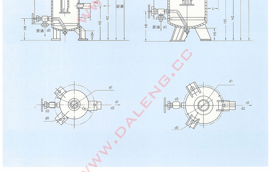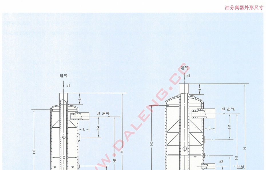 直立圆周筒形简体和上、下两个椭圆形封头焊成一体,上封头中心伸入一支进气管直至简体下部,并浸在液体制冷工质液面以下,开口处有一挡板,防止气流冲容器底,而由径向开口流出,经液氮洗涤后,较纯净的氨气向上流,经多孔挡板的又一次接触分离之后,由简体上部的侧向出气管排出。在筒体中部有供液氮接管,底部有放油阀。