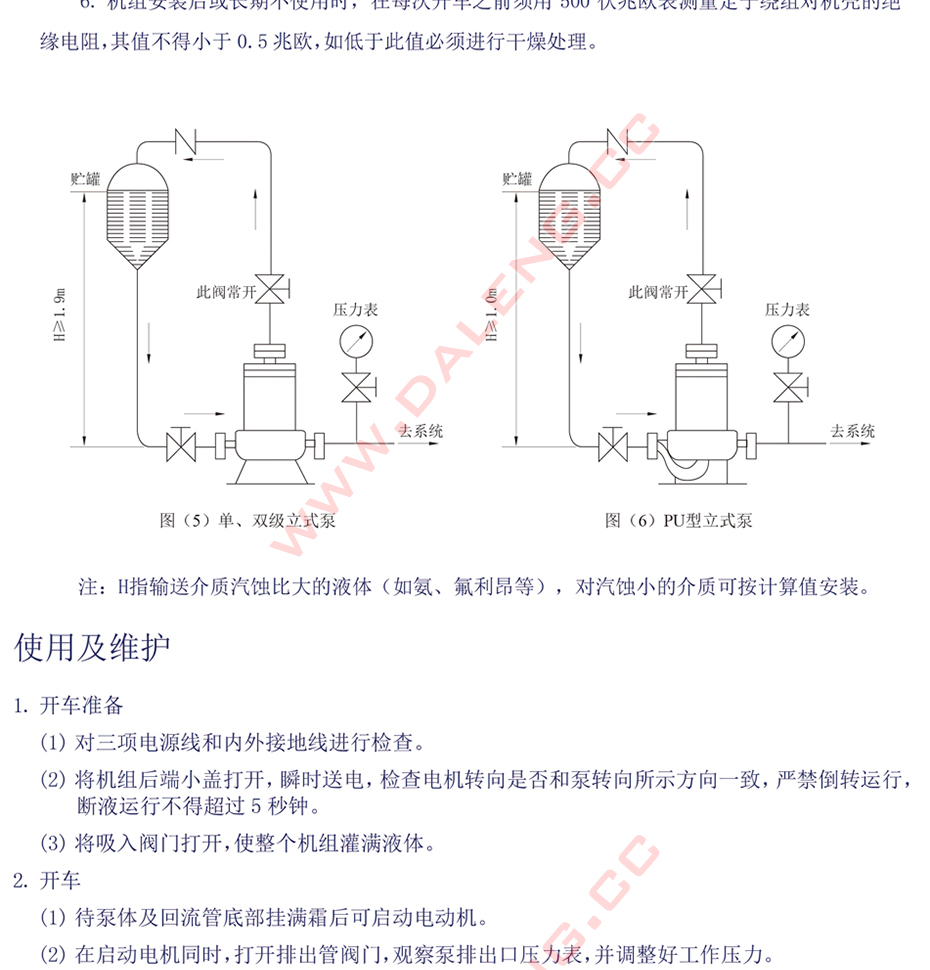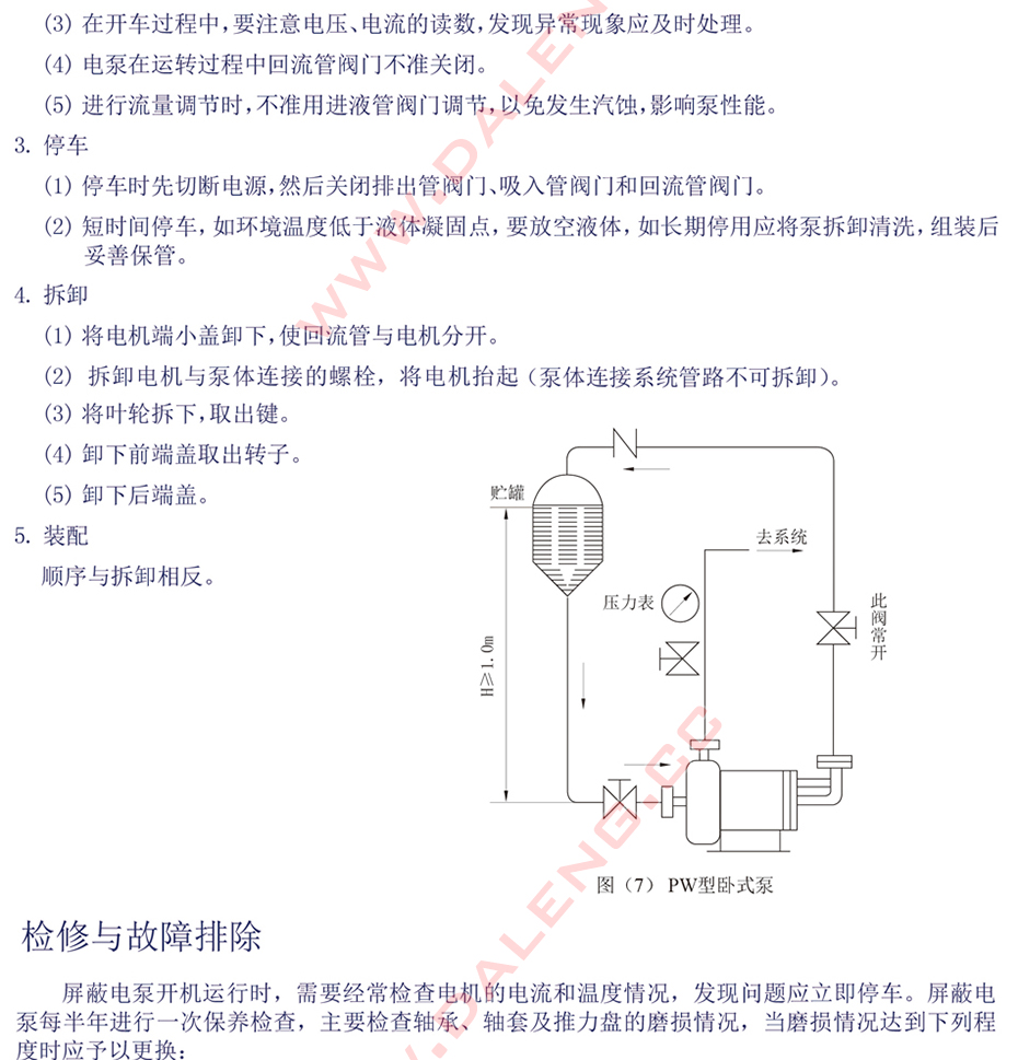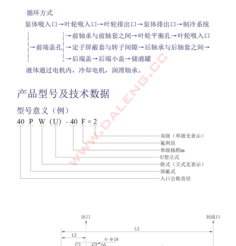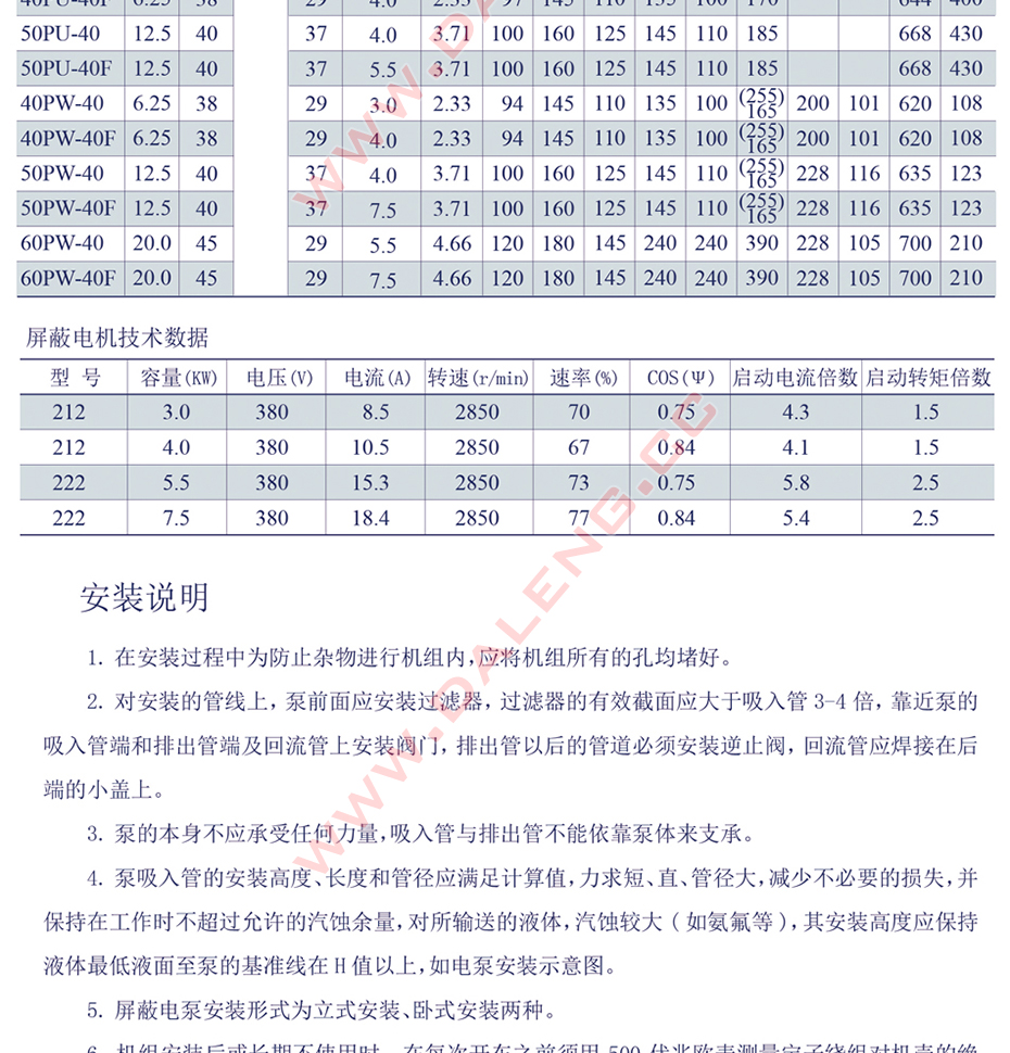 其中PU型、PW型系列屏蔽电泵的主要特征是在泵的进口处叶轮前端设有自吸能力装置。在氨氟制冷系统中,可以在-50℃的低温工况下保持正常的供液状态。并且因具有自吸能力,从而降低了对液体的液位高度设计要求,进一步降低了设备的安装高度。