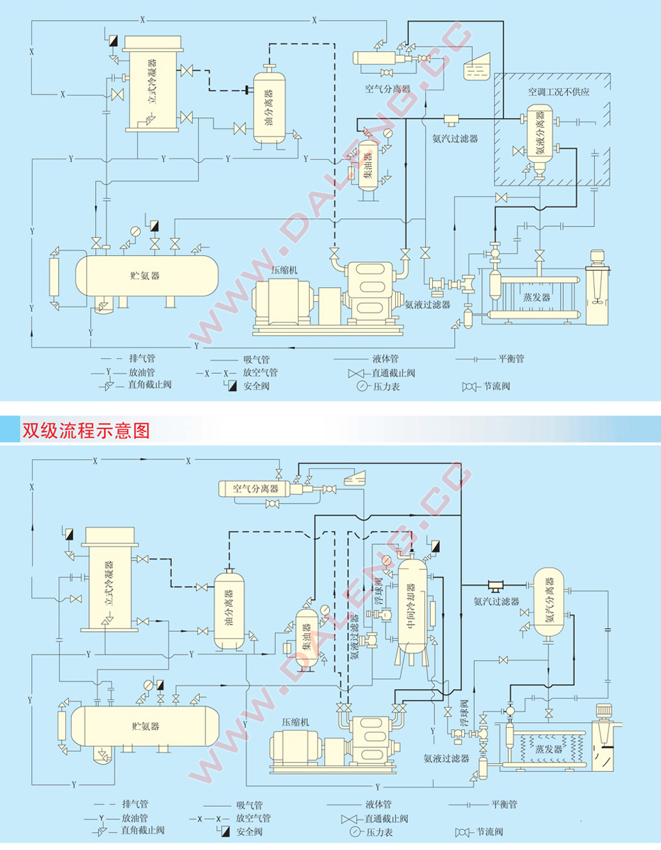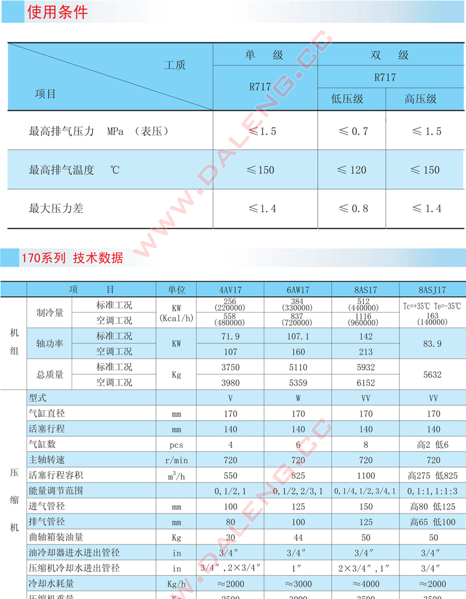 该系列压缩机在冷凝温度≤40℃,蒸发温度单级+5℃~-30℃,双级-25℃~-45℃的范围内,应用于需要实现人工制冷的场合。如石油、化工、制药等工业产品的生产, 食品的低温加工储藏和运输,工厂、医院及公众场所等大型建筑的空气调节等。